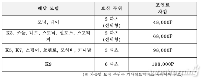 구체적으로 ‘K-스타일 케어+’ 프로그램 가입 시 차종에 따라 경형 4만8000포인트, 소형/준중형 6만8000포인트, 중형/준대형/대형 9만 8천 포인트, 플래그십 K9 19만8000포인트가 차감되며 빈번하게 발생하는 손상 부위를 선별하여 1년의 보장 기간 동안 △경/소/준중형 2부위 △중형/중대형/대형 3부위 △플래그십 K9 6부위로 각 부위별 1회씩 보상 수리 이용이 가능하다.
