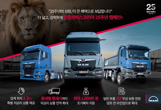 [오토모닝 정영창 기자] 만트럭버스코리아(이하 ‘만트럭’)가 한국법인 창립 25주년을 맞아 진행 중인 ‘만트럭버스코리아 25주년 기념 캠페인’의 혜택을 대폭 강화하고 지원 대상을 신규 고객까지 전격 확대한다.