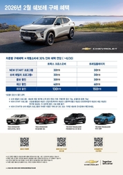 [오토모닝 정영창 기자] 쉐보레가 2월 한 달간 전 차종을 대상으로 금융 및 할인 혜택을 강화한 특별 프로모션을 실시한다. 쉐보레는 첫 차 구매를 준비하는 고객과 새학기·취업·결혼·이사 등 새로운 출발을 앞둔 고객을 위해 맞춤형 할인 프로그램을 제공한다. 또한 금융 프로그램과 현금 할인에 더해 유류비 지원과 특별 할인 등 다양한 혜택을 중복 적용해 고객 혜택 규모를 확대했다. 쉐보레는 트랙스 크로스오버 구매 고객을 위해 전월 대비 강화한 금융 프로그램을 마련했다. 36개월 기준 3.5%, 60개월 기준 4.0%의 이율을 적용해 금융 부담을 낮췄으며, 30만원 현금 할인 혜택도 함께 제공된다. 또한 2025년 생산 차량 구매 고객에게는 최대 40만원까지 유류비를 추가로 지원한다. 트레일블레이저 구매 고객에게는 30만원의 현금 할인 혜택과 함께 36개월 4.0% 또는 60개월 4.5% 이율의 할부 프로그램을 운영한다. 또한 2025년 생산 차량 구매 시 생산 시점에 따라 최소 40만원에서 최대 60만원까지 유류비 혜택을 추가로 지원한다. 쉐보레는 이번 2월 프로모션에서 새출발을 앞둔 고객의 라이프 이벤트에 맞춘 ‘New Start 특별 할인 프로그램’을 운영한다